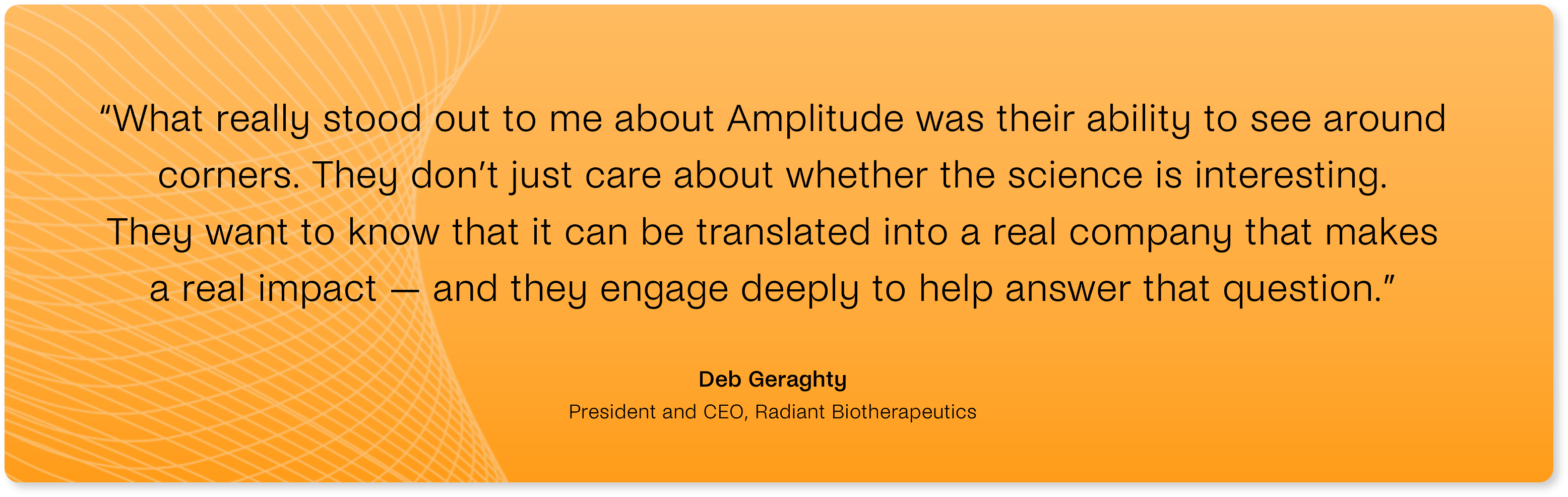 In 2025, Amplitude helped recruit Deborah Geraghty as Radiant’s new President and CEO, marking an important inflection point in the company’s evolution. A seasoned biotech executive with deep experience advancing large-molecule therapeutics and scaling science-driven organizations, Geraghty was drawn to Radiant because of the strength of its platform and the nature of its investor partnership.