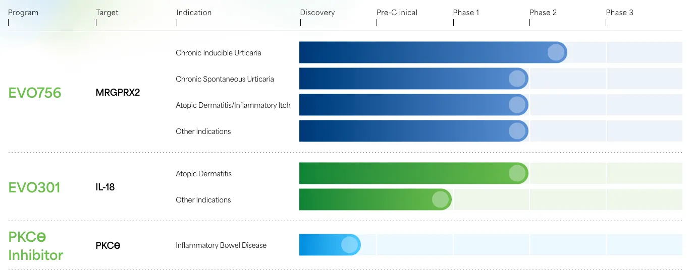 Since our investment in the Series B round we have actively worked with the team as a member of the Board and have seen management bring their lead program, a molecule targeting MRGPRX2, through phase 1 and initiate a phase 2 trial in Chronic inducible urticaria patients. The company plans to initiate a phase 2b trial of EVO756 in patients with chronic spontaneous urticaria (CSU) during the first half of next year with an additional trial in atopic dermatitis. To broaden their pipeline, the company in-licensed a second clinical program targeting IL-18 to be initially tested in atopic dermatitis patients.