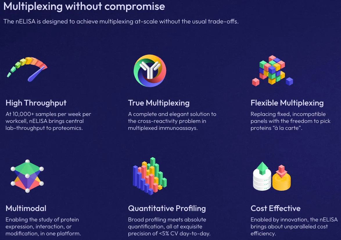 Nomic has developed a brand new platform called the nELISA which aims to make the human proteome as broadly and easily accessible as the human genome. This platform was developed as a next-generation ELISA platform for measuring proteins at scale and at high throughput. To measure proteins today, several companies leverage traditional multiplexing where you mix antibodies in traditional ELISAs but these can be limited by cross-reactivity and thus don’t give you the best results. Nomic has miniaturized immunoassays into small beads which isolates target-specific antibody pairs to their own colour-coded beads, thereby physically preventing cross-reactive interactions. This allows the company to get highly specific results but also allows them to leverage the high throughput capability of the ELISA platform, thereby allowing them to profile tens of thousands of samples in a fraction of the time at a fraction of the cost.