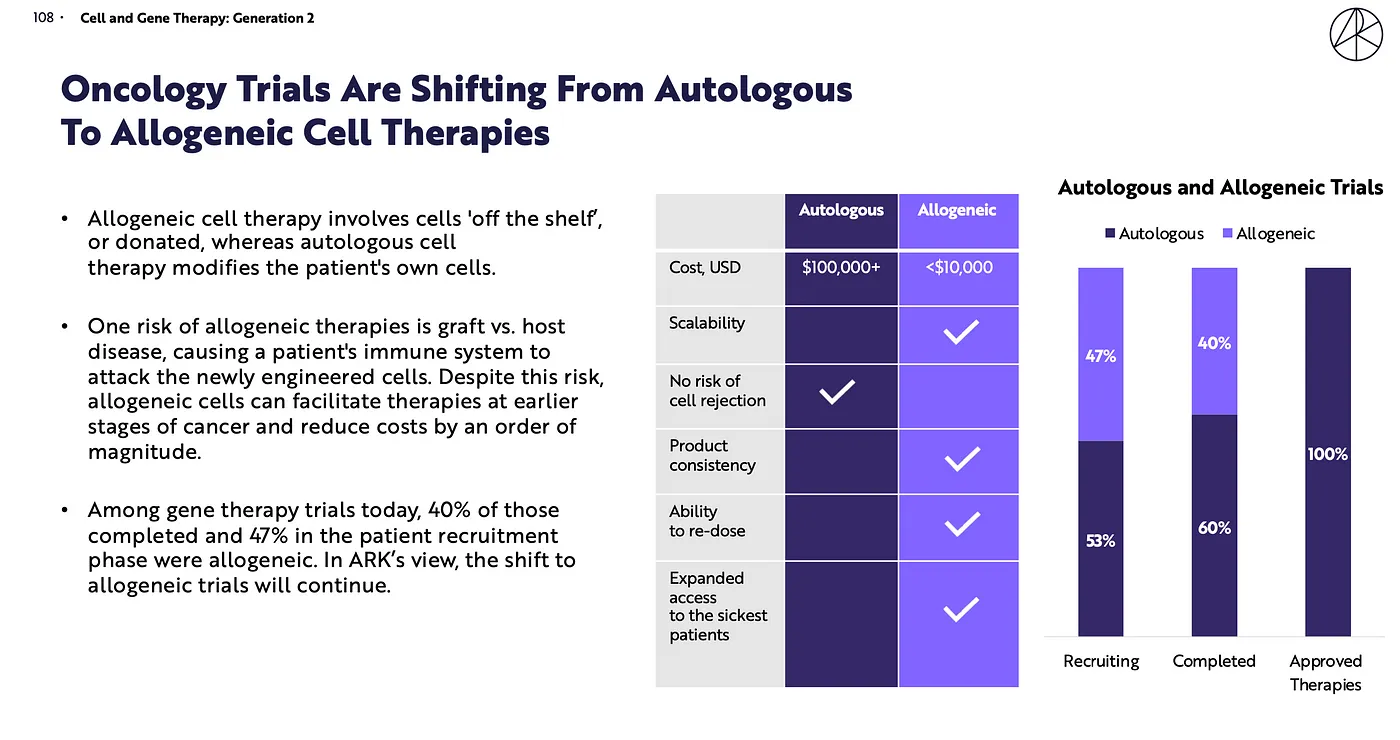 In the cell therapy field, the process is the product, and it is clear that allogeneic outperforms autologous on a number of aspects of the process. We are not alone in this belief as evidenced by the stellar syndicate that Notch was able to attract, as well as key opinion leaders and investors in the space who understand that cell therapies are moving from autologous to allogeneic. ARK Invest, a leading investment company focused on disruptive technologies and innovative companies, recently published their ‘Big Ideas 2021’ report and cited the shift of cell and gene therapies from autologous to allogeneic as one of their big ideas, potentially increasing the total addressable market by $70 billion.