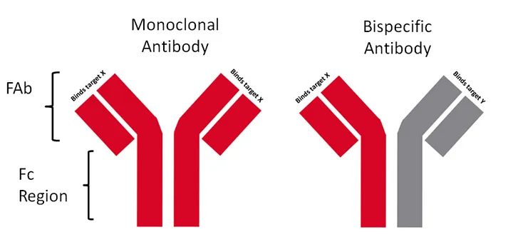 In the last decade, technology in this area has advanced with the development of bispecific antibodies. First-generation antibodies, or monoclonal antibodies, have two arms that recognize the same target or antigen or the same binding domain. Bispecific antibodies on the other hand are engineered with two unique binding domains, meaning they can exert their effects on two separate targets at once.